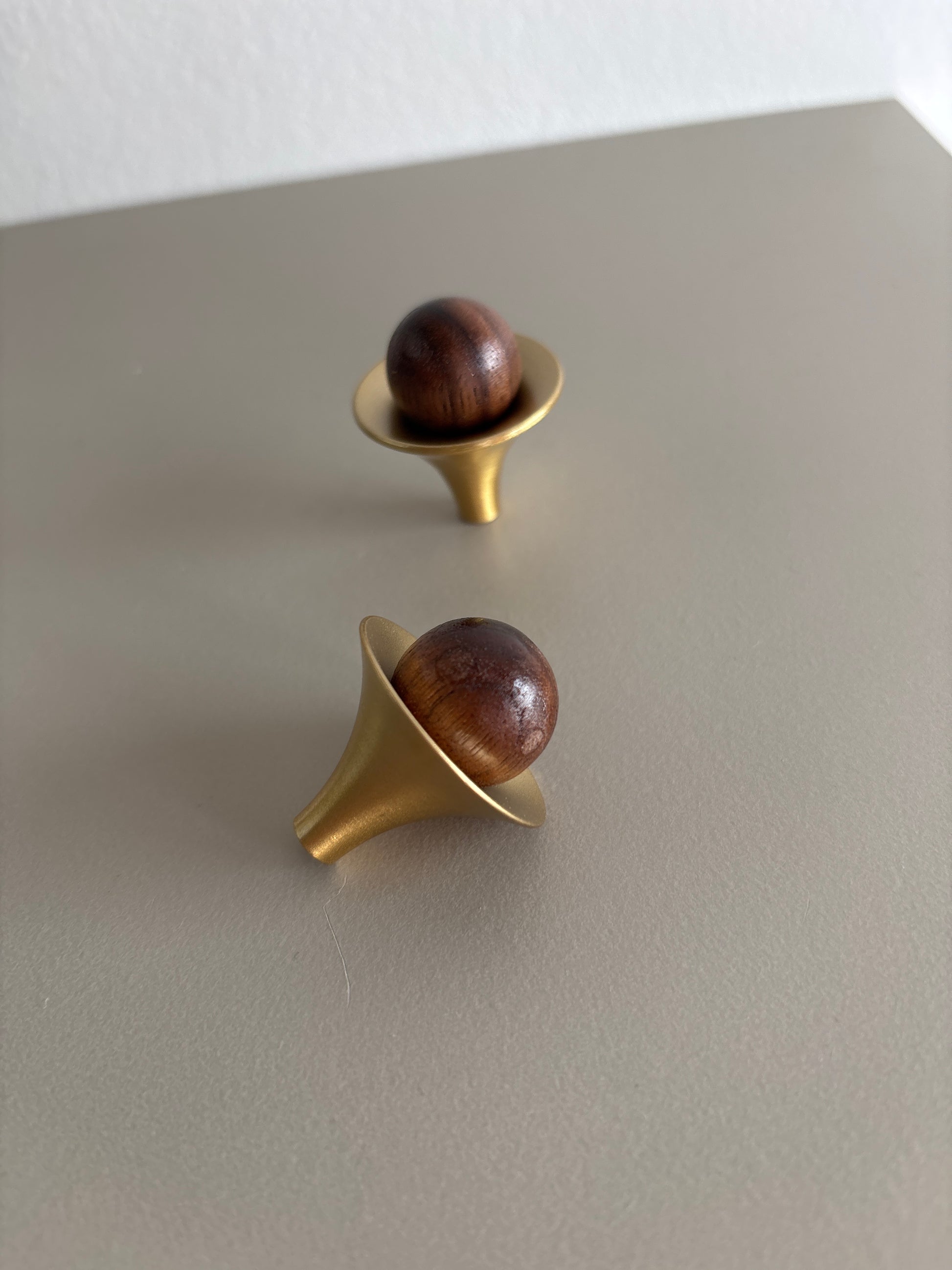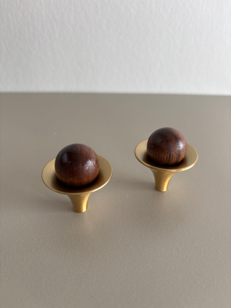 2 stk møbelknopper i træ med hardware i børstet messinglook.