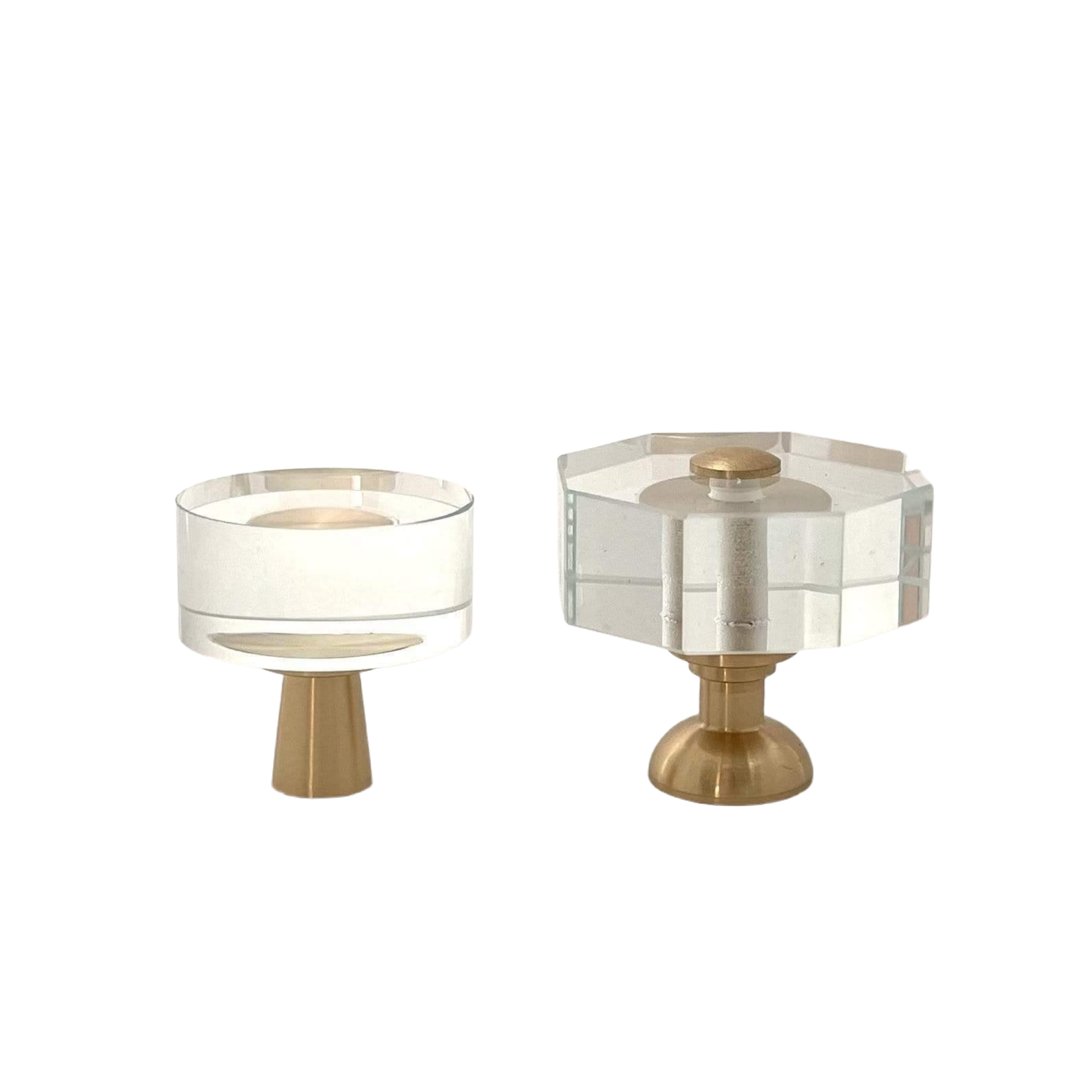 Model 1, rund: Diameter: 25 mm Højde: 26 mm Farve og materiale: Klar akryl og messing