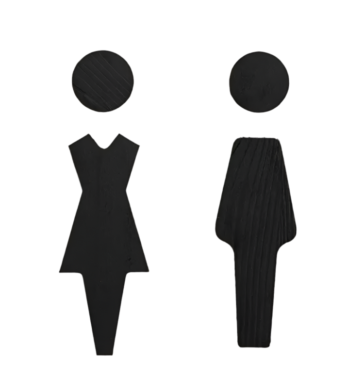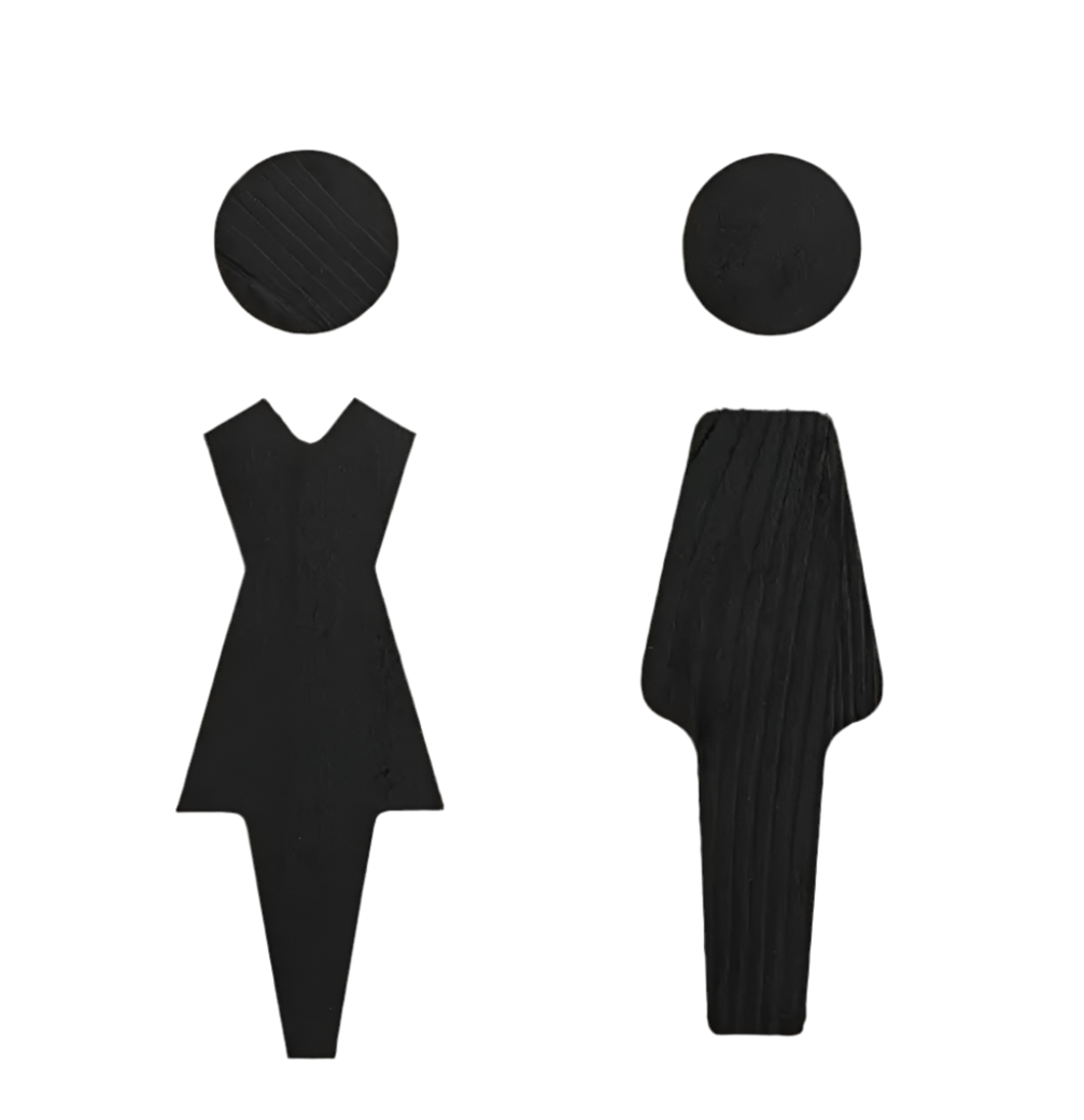 Toiletskilt – kvinde og mand i sort træfiner.